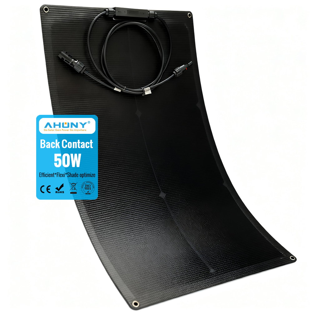 AHONY 50w full black Back Contact Cell Flexible Solar Panel represents a cutting-edge advancement in photovoltaic technology. Unlike traditional solar cells, which have busbars and gridlines on the front surface, Back Contact (BC) cells relocate all electrical contacts to the rear side of the cell. This design eliminates front-side shading, significantly increasing light absorption and overall efficiency. When combined with lightweight, flexible materials, these panels are not only highly efficient but also bendable, making them ideal for a wide range of curved or space-constrained surfaces.